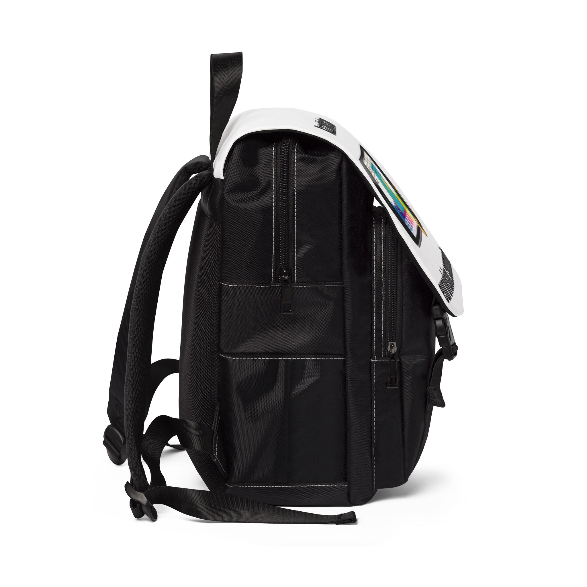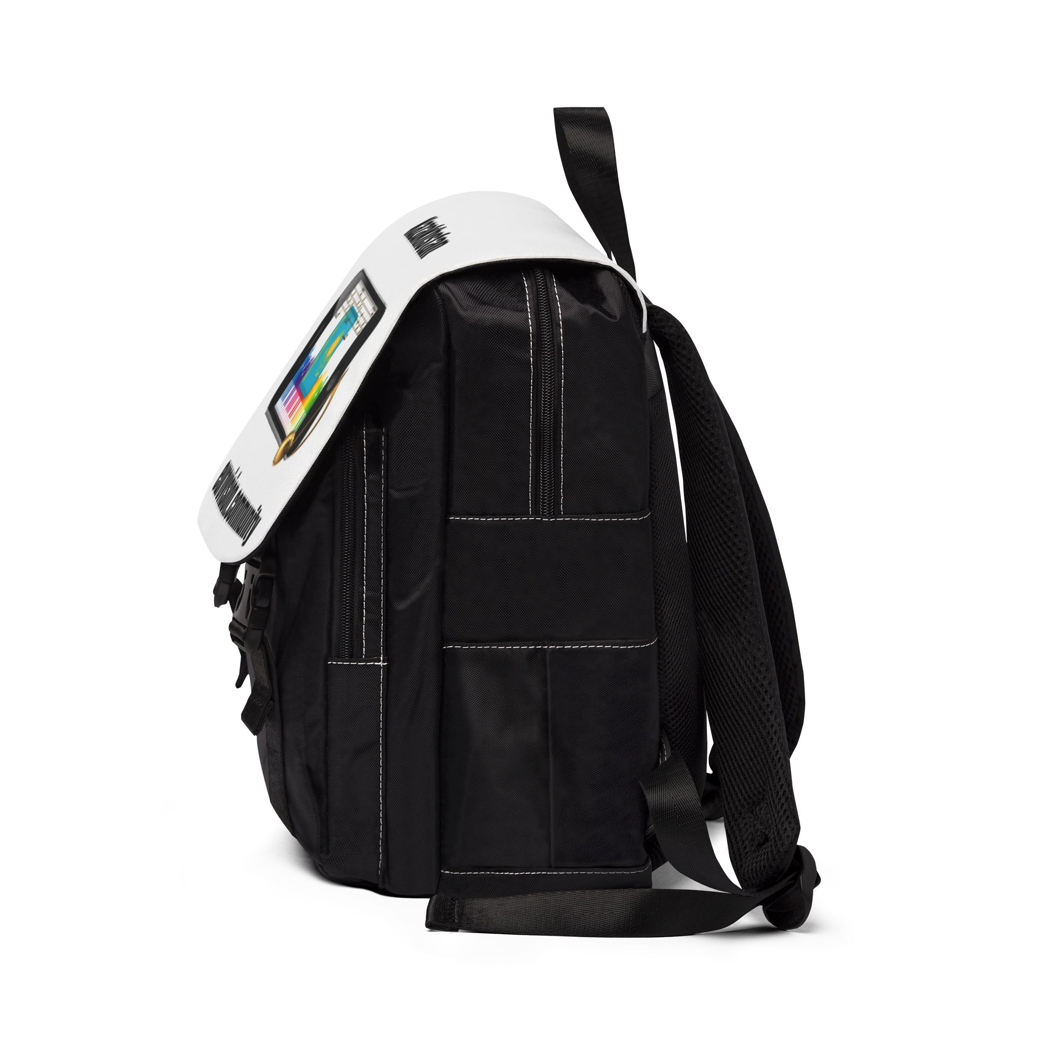 Casual backpack in a classic shape with a front flap design. It is made of durable Oxford canvas. It has two slip interior pockets and one laptop sleeve in the main compartment, a front zipper pocket, and two side pockets.
